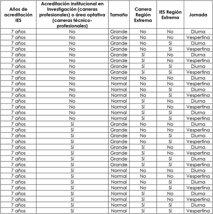 12º. Que la metodología establecida en la Resolución Exenta N° 6.255, de 2022, establece un procedimiento para la conformación de "grupos de carreras" a través de dos etapas. En la primera, las carreras son clasificadas en "macrogrupos" a partir del tipo de carrera (profesional o técnico-profesional) y su estructura curricular, definida esta última a partir de las Áreas y Subáreas de la Clasificación Internacional Normalizada de Educación (CINE-F 2013) establecida por la Organización de las Naciones Unidas para la Educación, la Ciencia y la Cultura ("UNESCO"). En la segunda etapa, al interior de cada "macrogrupo" se conforman grupos definitivos en función de los años de acreditación de la Institución que imparte la carrera, su acreditación en investigación (para carreras profesionales) o en algún área optativa (para carreras técnico-profesionales), el tamaño de la Institución definido en función de su número de sedes, la región en la cual se ubica la carrera y/o la sede central de la Casa de Estudios, y la jornada en la cual se imparte la carrera.
