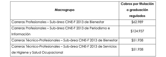 Asimismo, para la regulación de los cobros por concepto de titulación o graduación, se debe calcular el valor promedio por estudiante de los costos asociados a los procesos de titulación, para cada uno de los "macrogrupos" a regular.