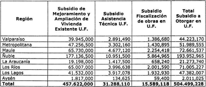 "38. Los recursos involucrados en la selección ascenderán a un total de 504.499.228 UF y su distribución nacional será la siguiente: