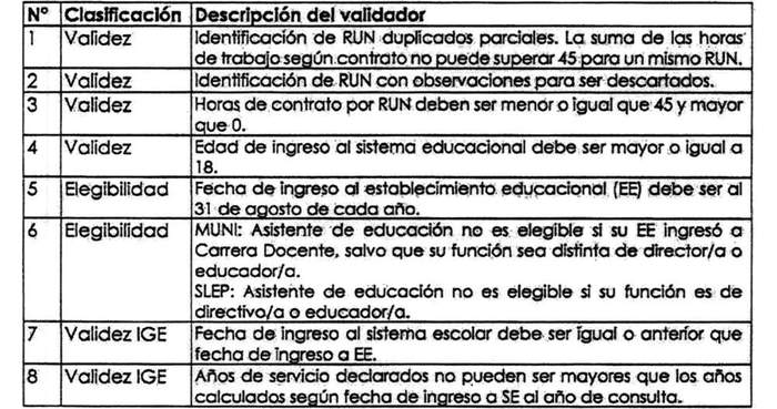 8. Que, con la base referida en el numeral anterior, esta Subsecretaría de estado elaboró las nóminas de beneficiarios del bono en comento que se desempeñan en establecimientos financiados vía transferencia de fondos por la Junta Nacional de Jardines Infantiles, tomando en consideración ocho validadores, distribuidos en tres conceptos: a) Validez, que engloba cuatro validadores, los que evalúan sl los datos entregados corresponden a información válida. Es decir, el no cumplimiento de estos cuatro validadores permite asumir que existe un error en la información entregada, imposibilitando así asignar el beneficio al registro; b) Elegibilidad: concepto que engloba dos validadores, que evalúan si los datos entregados se alinean con las exigencias legales para la obtención del beneficio. Su no cumplimiento no implica que la información sea errónea, sino que ésta simplemente no reúne las condiciones necesarias para que el registro sea considerado elegible para el beneficio; y c) Validez IGE: concepto similar al de validez del punto 1, que engloba dos validadores. La diferencia radica en que éste evalúa la validez sólo de las variables ligadas al cálculo del componente variable del bono (dado por el puntaje IGE), permitiendo así evaluar por separado la validez de la información. Esto permitiría asignar el componente base del bono a registros con validez (punto 1), independiente de si las variables asociadas al cálculo del IGE son válidas o no.