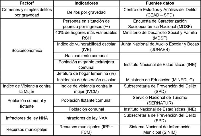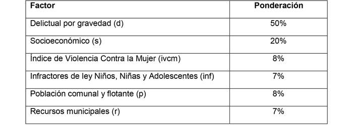 Índice Más Equidad, Más Seguridad = Variables delictuales por gravedad (50%) + Variables socioeconómicas (20%) + índice de violencia contra la mujer (8%) + Infractores de Ley NNA (7%) + población comunal y flotante (8%) - Recursos municipales (7%).