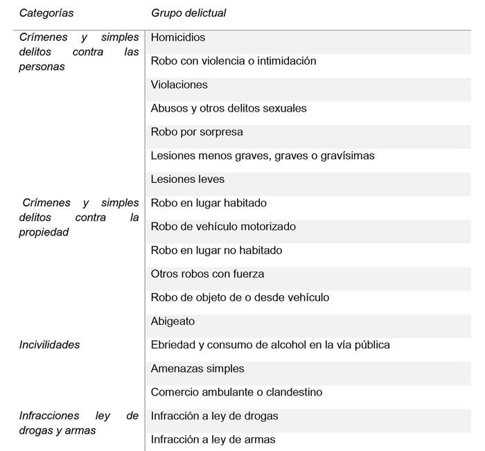 - Categorías delictuales por gravedad: corresponde a la frecuencia de una serie de agrupaciones de crímenes, simples delitos y faltas, los cuales son ponderados por su gravedad a partir del Código Penal, así como otras disposiciones legales que sancionan delitos o faltas.