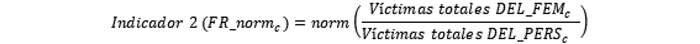 V. Para la construcción del Indicador 2 se computará la frecuencia relativa (FR) dividiendo el conteo de víctimas mujeres de crímenes y simples delitos DEL_FEM en la comuna "c" por el total de víctimas de crímenes y simples delitos contra las personas (DEL_PERS) en la misma comuna. El resultado se normalizará de la misma forma que en punto II. Lo anterior se expresará en la fórmula siguiente.