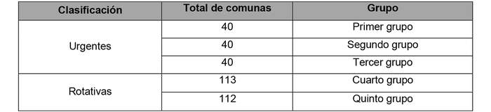 Se establecerán dos grupos generales, las comunas urgentes y las rotativas. Serán comunas urgentes, aquellas 120 que presenten mayores puntajes en el índice, siendo comunas rotativas las restantes 225.