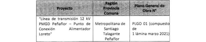 Artículo 2°.- El proyecto "Línea de transmisión 12 kV PMGD Peñaflor - Punto de Conexión Alimentador Loreto", en adelante, el "Proyecto" tiene por objeto realizar la interconexión de un Pequeño Medio de Generación Distribuida (PMGD), denominado Parque Fotovoltaico Peñaflor, el que se conectará con el Sistema Eléctrico Nacional en punto de conexión P.P 679791 Alimentador Loreto, instalación de la red de distribución de la empresa CGE Distribución.