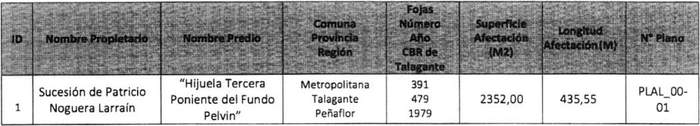 Artículo 7°.- Constitúyase, de acuerdo con lo que sobre el particular dispone la Ley General de Servicios Eléctricos, la servidumbre para el establecimiento del proyecto "Línea de transmisión 12 kV PMGD Peñaflor - Punto de Conexión Alimentador Loreto", en el predio que se indican a continuación: