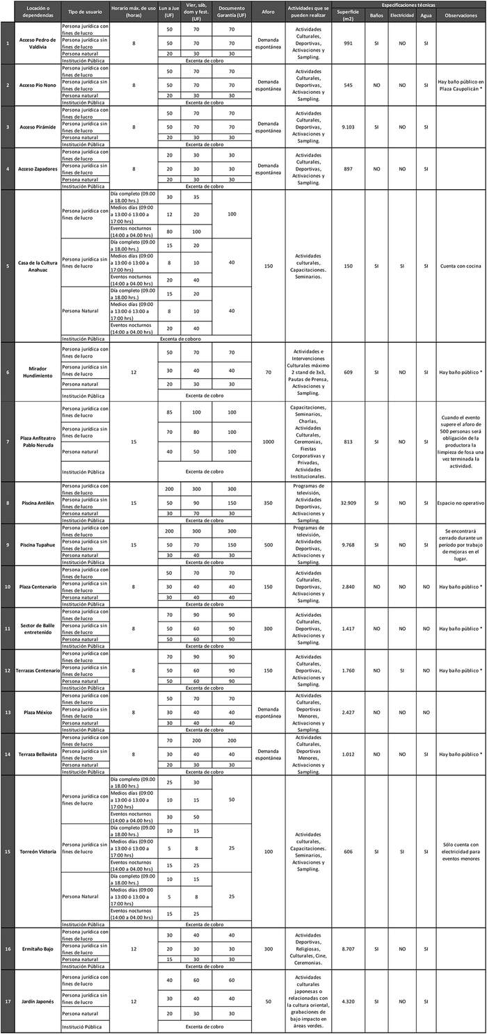8° Déjase constancia que, en circunstancias debidamente fundadas, los valores consignados en este tarifario para Instituciones Privadas con o sin fines de lucro o personas naturales podrán ser rebajados o eximidos, teniendo presente especialmente el público al que van dirigidas las actividades, la vulnerabilidad de los beneficiados y que los fines del uso de las locaciones se ajusten a los fines del Parque Metropolitano de Santiago. Asimismo, respecto de los requerimientos de uso de locaciones o dependencias del Parque Metropolitano de Santiago, solicitados por otros Servicios o Instituciones Públicas para la realización de sus actividades oficiales, dichas instituciones quedarán eximidas del pago de tarifa, por lo que su uso será gratuito.