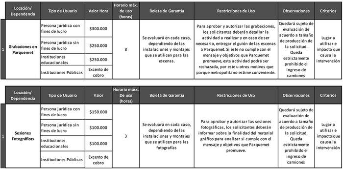 d) Que, en virtud de la facultad conferida por el ordenamiento jurídico al Parque Metropolitano de Santiago y de lo establecido en la Política Nacional de Parques Urbanos, resulta necesario actualizar el tarifario para el uso o arriendo temporal de locaciones y dependencias del Parque Metropolitano de Santiago, con el objetivo de uniformar las tarifas proscribiendo cualquier tipo de discriminación arbitraria, para lo cual se tendrán en consideración la naturaleza jurídica del solicitante, el aforo que comprenderán las actividades, el tipo de actividades y/o eventos que se podrán realizar, la forma de pago de la tarifa fijada, la existencia de garantías que caucionen el pago de las tarifas, el procedimiento para la tramitación de las solicitudes, entre otros aspectos que se regularán. De igual manera, se establecerán las causales de rebaja y/o eximición de pago de las tarifas fijadas, las que atenderán a razones específicas.