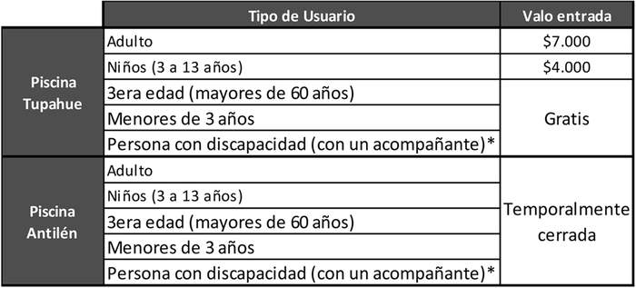 4° Establézcase, a contar de su publicación en el Diario Oficial, los siguientes precios de las entradas a la Piscina Tupahue del Parque Metropolitano de Santiago: