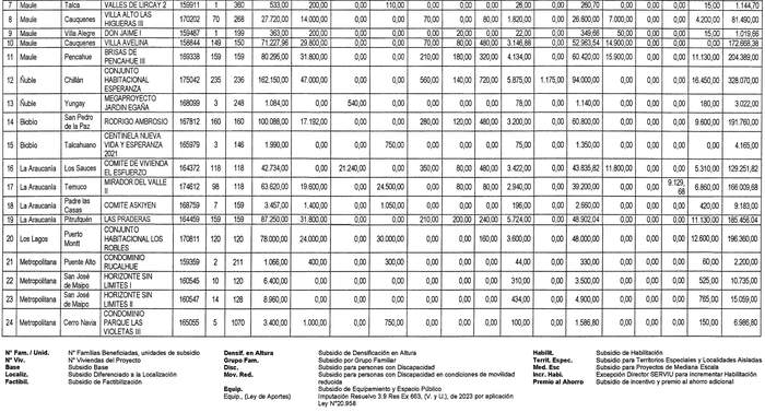 4. Los recursos comprometidos en el resuelvo 2. de la presente resolución, para los proyectos seleccionados en el cierre de postulación efectuado el día 6 de abril de 2023, del concurso a que se llamó mediante la resolución exenta Nº 663 (V. y U.), de 2023, se resumen en el siguiente cuadro para cada región del país, incluyendo la suma total de familias beneficiadas y las Unidades de Fomento comprometidas, considerando los montos de subsidio de los proyectos, incluidos sus respectivos servicios de asistencia técnica y fiscalización técnica de obras: