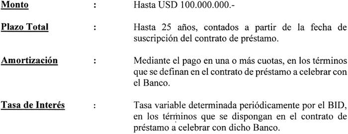 1.- Autorícese al Ministro de Hacienda para que, en representación de la República de Chile, contrate con el Banco Interamericano de Desarrollo, un préstamo hasta por la suma de USD 100.000.000.- (cien millones de dólares de los Estados Unidos de América), o su equivalente en otras monedas, más los intereses y comisiones que correspondan.