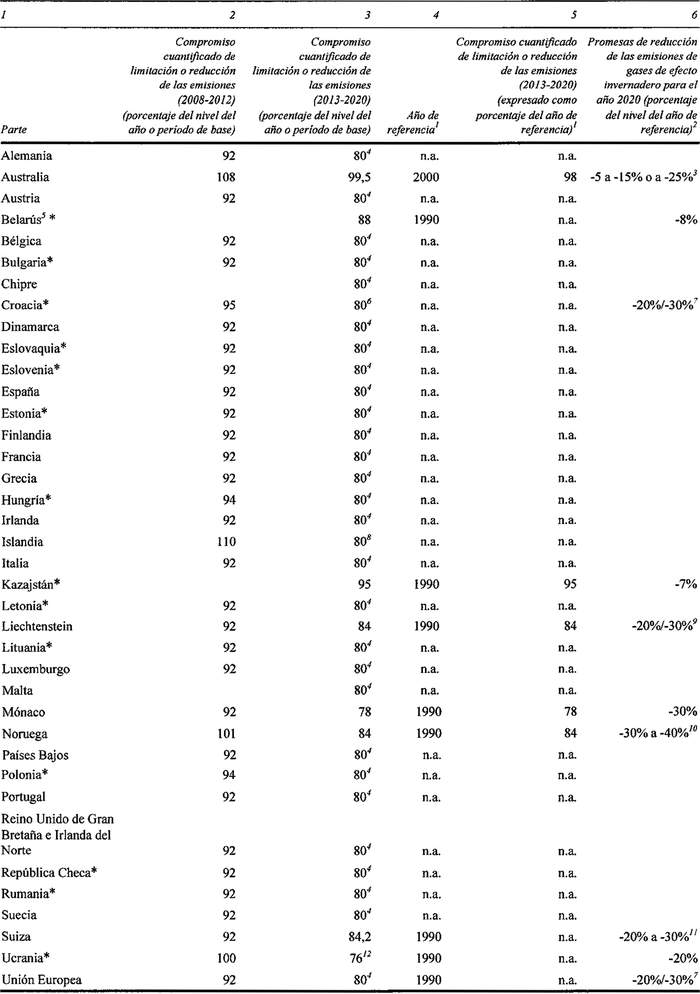 1 Las Partes podrán, a título facultativo y para sus propios fines, utilizar un año de referencia para expresar sus compromisos cuantificados de limitación o reducción de las emisiones (CCLRE) como un porcentaje de las emisiones de ese año, que no será internacionalmente vinculante en el marco del Protocolo de Kyoto, además de indicar sus CCLRE en relación con el año de base en la segunda y la tercera columna de este cuadro, que sí son internacionalmente vinculantes.