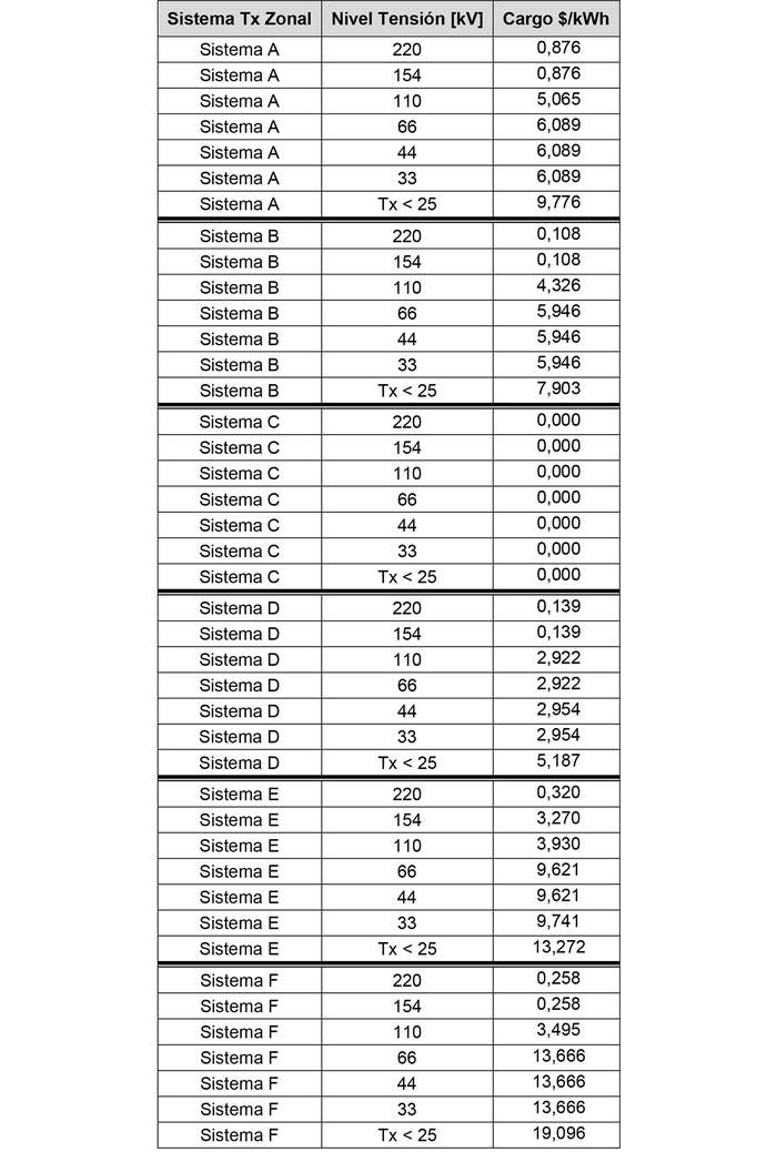 Tabla 1: Cargos asociados al segmento de transmisión zonal para clientes regulados y libres