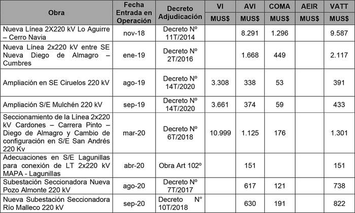 3.4.1.3 VATT de obras con fecha de entrada en operación posterior al 31 de diciembre de 2018