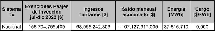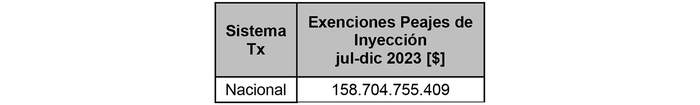Tabla 24: Cargo asociado a exenciones peajes de inyección