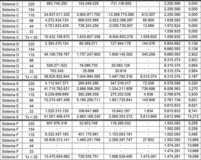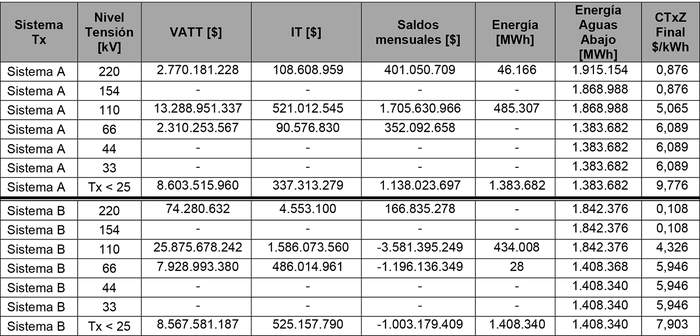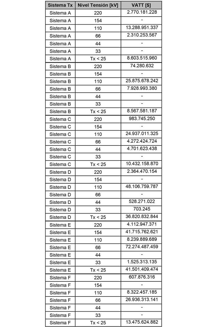 De acuerdo con lo indicado en las secciones 3.2, 3.3, 3.5 y 3.10.3 de este informe, en la siguiente tabla se presentan los antecedentes considerados para la determinación del Cargo de Transmisión Zonal, por sistema y nivel de tensión.