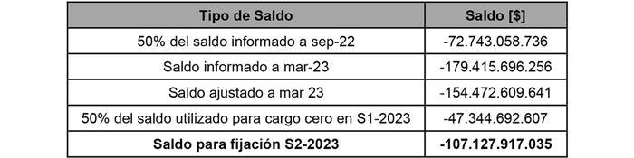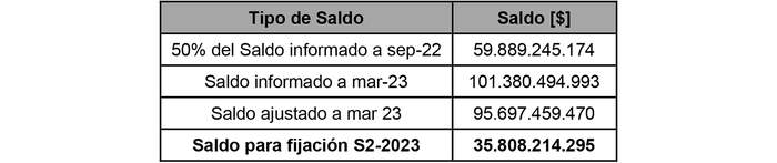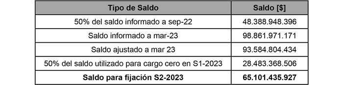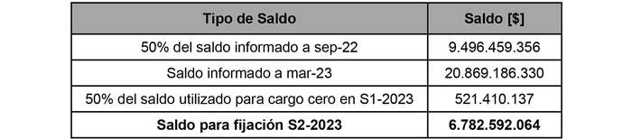 De acuerdo con lo indicado en la fijación del primer semestre de 2023, en base a lo establecido en el artículo 155° del Reglamento, el saldo informado a septiembre 2022 fue considerado de manera parcial en dicha fijación, al dividirse en cuatro fijaciones semestrales.