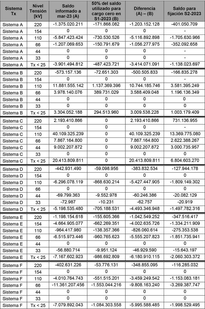 En base a lo anterior, para la presente fijación, el saldo asociado a la transmisión zonal se consideró en el cálculo del cargo correspondiente como el valor resultante entre la diferencia de los saldos informados a marzo 2023 y el 50% de la porción los saldos informados a septiembre 2022 utilizado en la fijación del cargo del primer semestre de 2023. Finalmente, el valor resultante del saldo indicado considera que será recaudado en tres fijaciones semestrales, tal como se señala en la fijación del primer semestre de 2023. Un resumen del cálculo anterior se presenta en la Tabla 21, separado por sistema zonal y nivel de tensión: