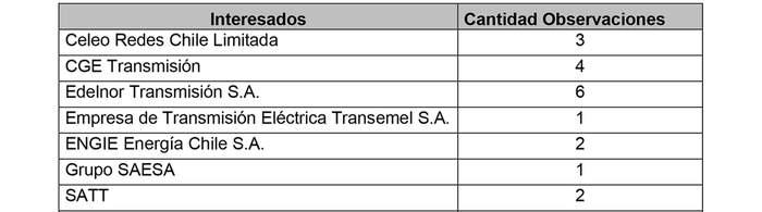 18) Que, las empresas Celeo Redes Chile Limitada, CGE Transmisión S.A., Edelnor Transmisión S.A., Empresa de Transmisión Eléctrica Transemel S.A., ENGIE Energía Chile S.A., Grupo SAESA y Transelec S.A. remitieron oportunamente sus observaciones a esta Comisión, las que se encuentran publicadas como anexo de la presente resolución exenta en el sitio web de la Comisión, mientras que, se deja constancia que la empresa Interchile, presentó una observación fuera del plazo, por lo que no fue considerada por esta Comisión;