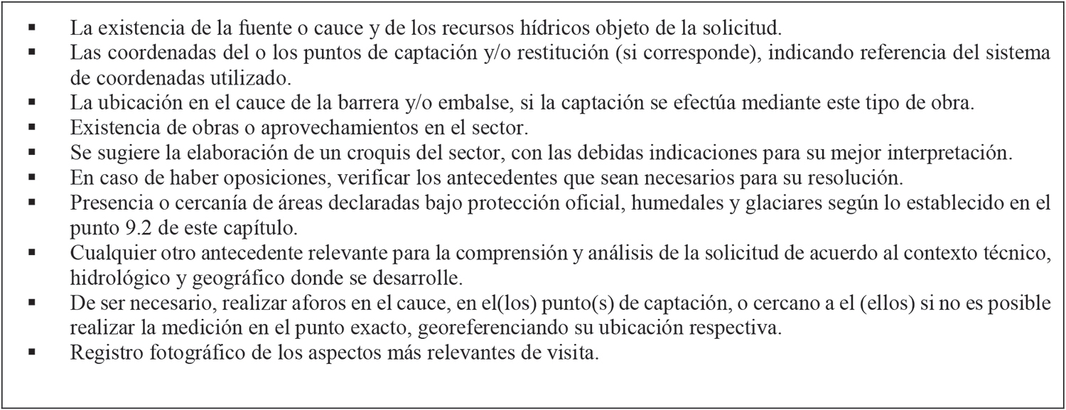 Aspectos a verificar y contenidos mínimos en la inspección ocular de la solicitud de derecho de aprovechamiento de aguas superficiales.
