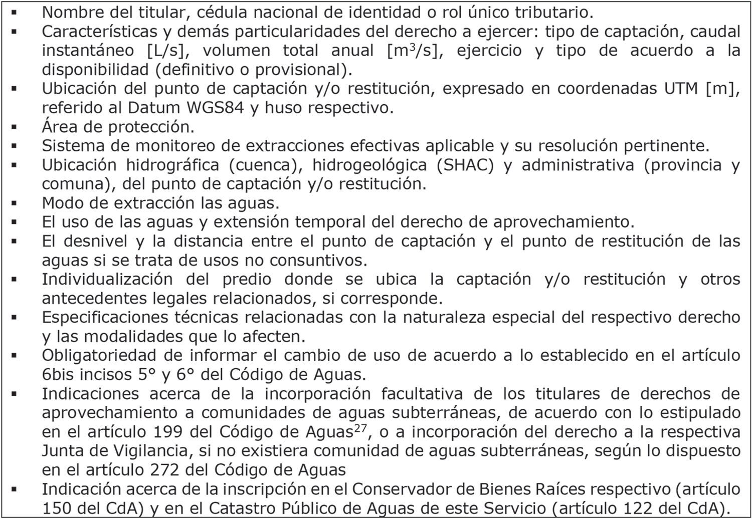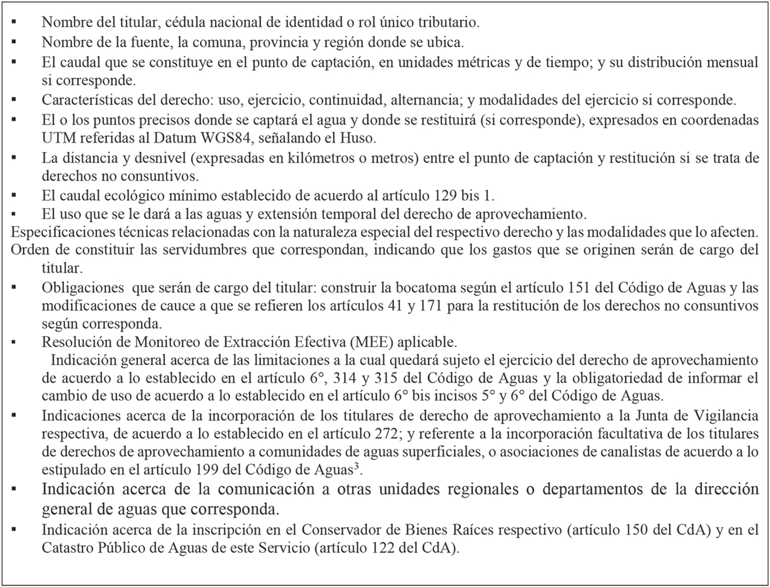 La resolución que constituya el derecho de aprovechamiento deberá ajustarse a lo dispuesto en el artículo 149 del Código de Aguas y deberá contener, al menos, lo siguiente: