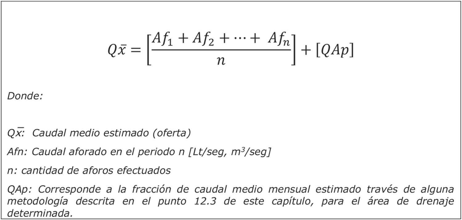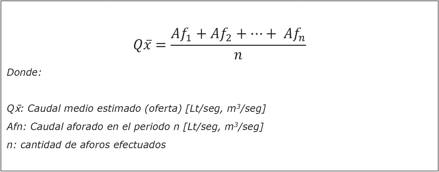 Se deberá planificar la cantidad de aforos considerados suficientes para efectuar el análisis de disponibilidad. En fuentes sin información hidrológica, es recomendable realizar como mínimo 2 aforos en periodo de estiaje con al menos 30 días de diferencia. Dependiendo de las circunstancias, en algunos casos se podrán considerar la realización de aforos adicionales en periodos distintos.