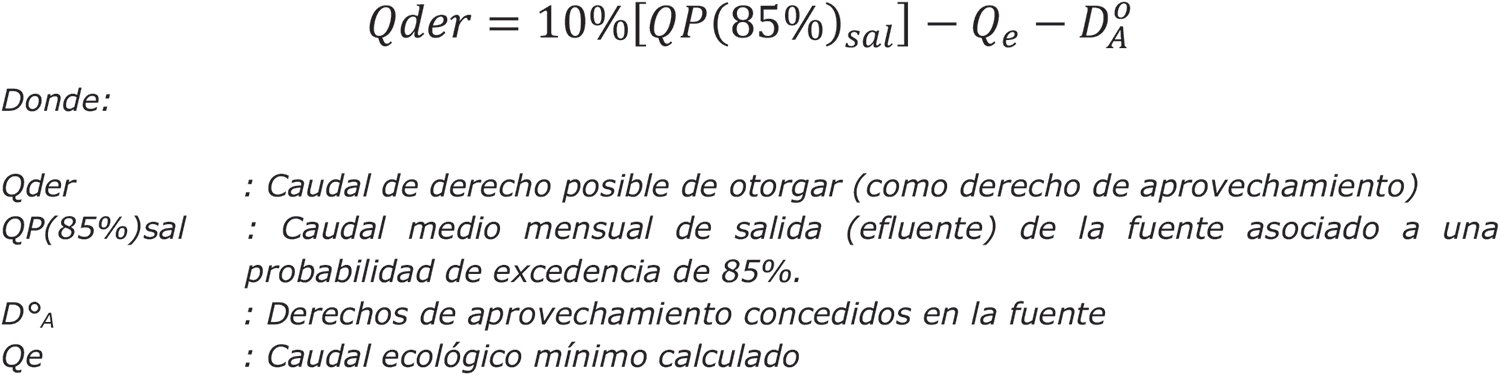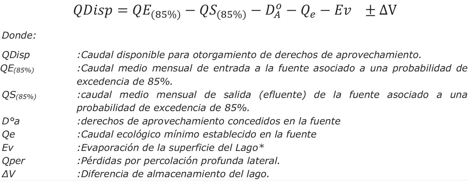 Corresponde al volumen de agua aprovechable asociado a derechos de aprovechamiento constituidos o reconocidos, derechos susceptibles de ser constituidos conforme a los artículos 147 bis inciso 3º del Código de Aguas, artículos 3º, 4º y 6º transitorios de la ley 20.017, y estimados de acuerdo a lo establecido en los artículos 47; 48; 56 y 56 bis del Código de Aguas.