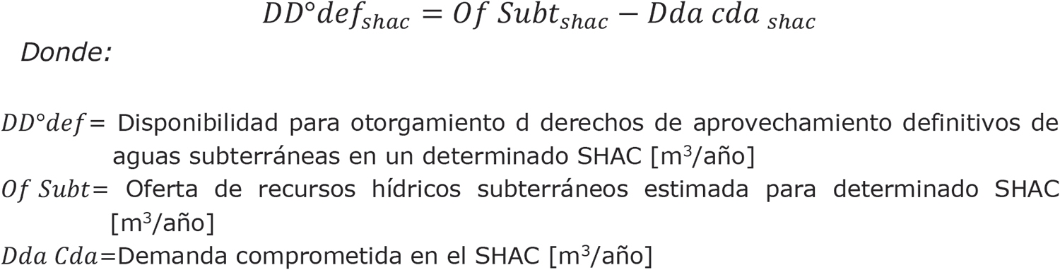 Considerando el concepto de sustentabilidad, la disponibilidad a nivel de fuente (SHAC) corresponderá al volumen de agua subterránea posible de ser otorgada como derechos de aprovechamiento definitivos de aguas subterráneas, y se obtiene como resultado del balance entre la oferta de recursos hídricos subterráneos y la demanda comprometida.
