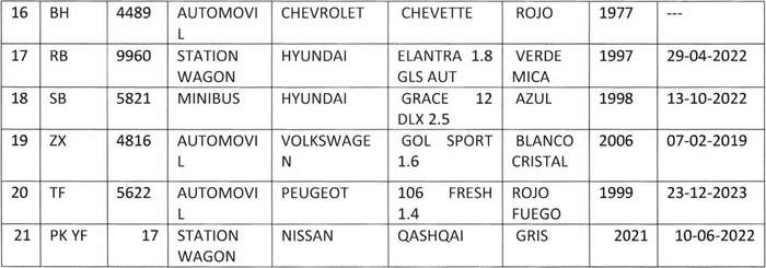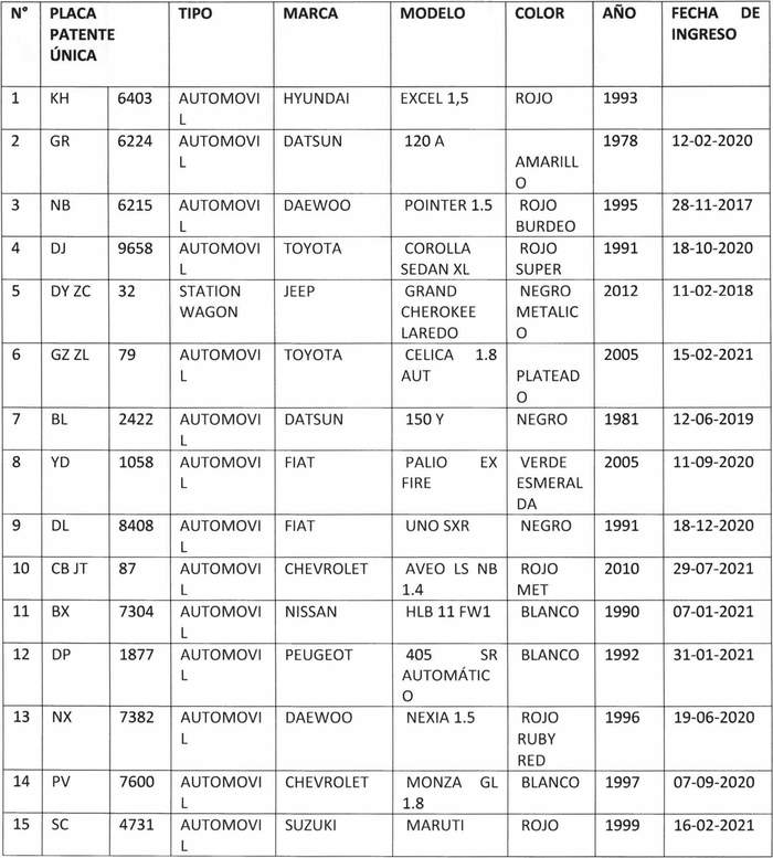 1. Publíquese por tres veces en el Diario Oficial el siguiente listado de vehículos que se encuentran ingresados en el aparcadero municipal, los días 17 de julio, 16 de agosto y 15 de septiembre del año 2023, mediando 30 días entre un aviso a otro:
