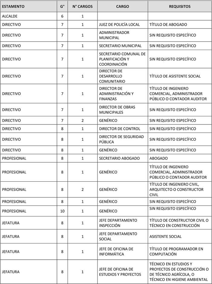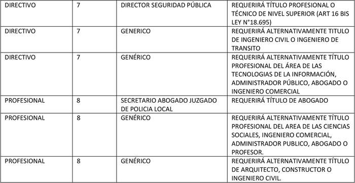 i) En estos cargos se establecen cambios a los requisitos específicos para cada cargo, en atención a los constantes cambios normativos que imponen cada vez mayores responsabilidades de índole profesional en las unidades municipales, se requiere que cumplan funciones determinadas que el reglamento establece, cuenten con perfiles especiales, adicionales a lo establecido en la ley Nº 18.883 para cargos relevantes y estratégicos para la gestión.