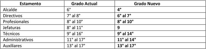 g) Que al modificar el grado del Alcalde de grado 6 a grado 4 permite a la Municipalidad mejorar los cargos de estamento de directivos, otorgando la posibilidad de impulsar la carrera funcionaria de quienes actualmente ocupan algunos cargos directivos en el municipio; pasando de grado 7 a grado 6.