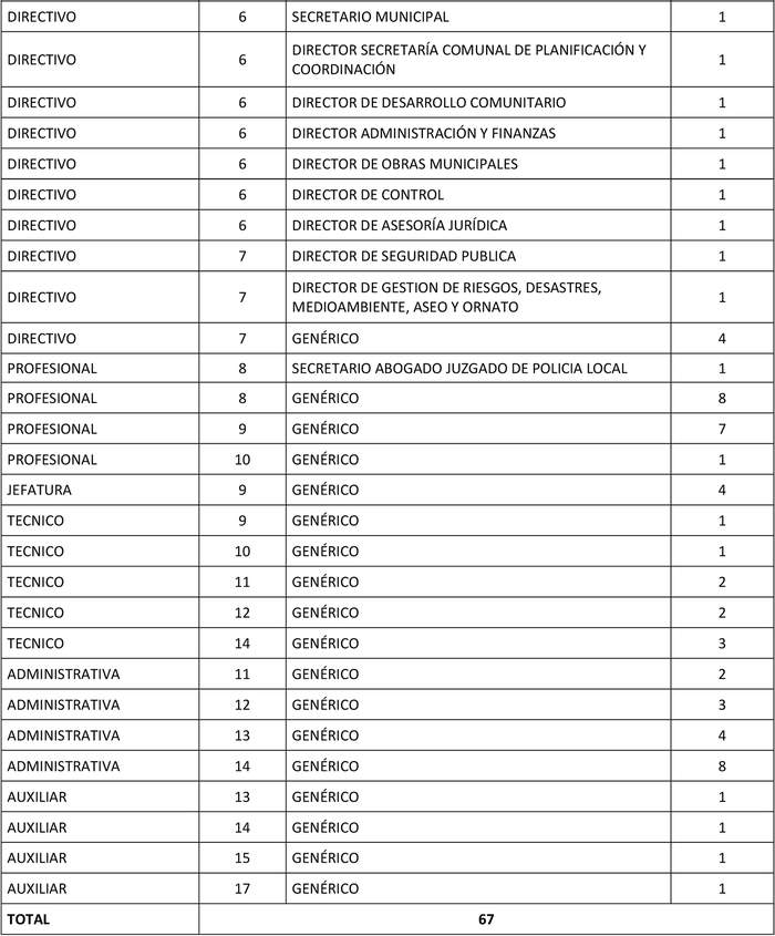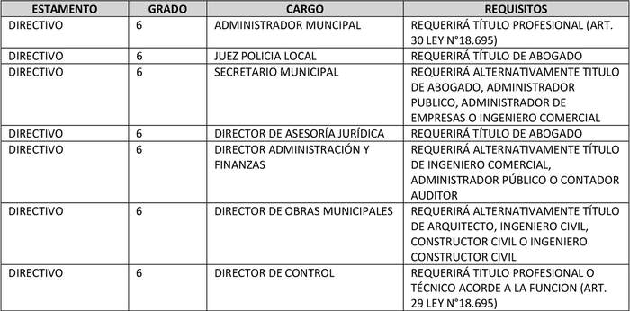 h) Se mantienen los cargos directivos, actualizando el grado en el que se encuentran, en virtud de la equidad necesaria dentro del mismo estamento; se modifican a grado 6 los cargos de Juez de Policía Local, Administrador Municipal, los directivos de las unidades mínimas, y el cargo de Director de Obras, en atención al desarrollo y crecimiento comunal y el aumento de las aprobaciones que deben realizar por fusiones, subdivisiones y modificaciones de deslindes de predios, además de los anteproyectos y proyectos de obras de urbanización y edificación y otorgación de permisos. Los demás cargos directivos se contemplan en grado 7º.