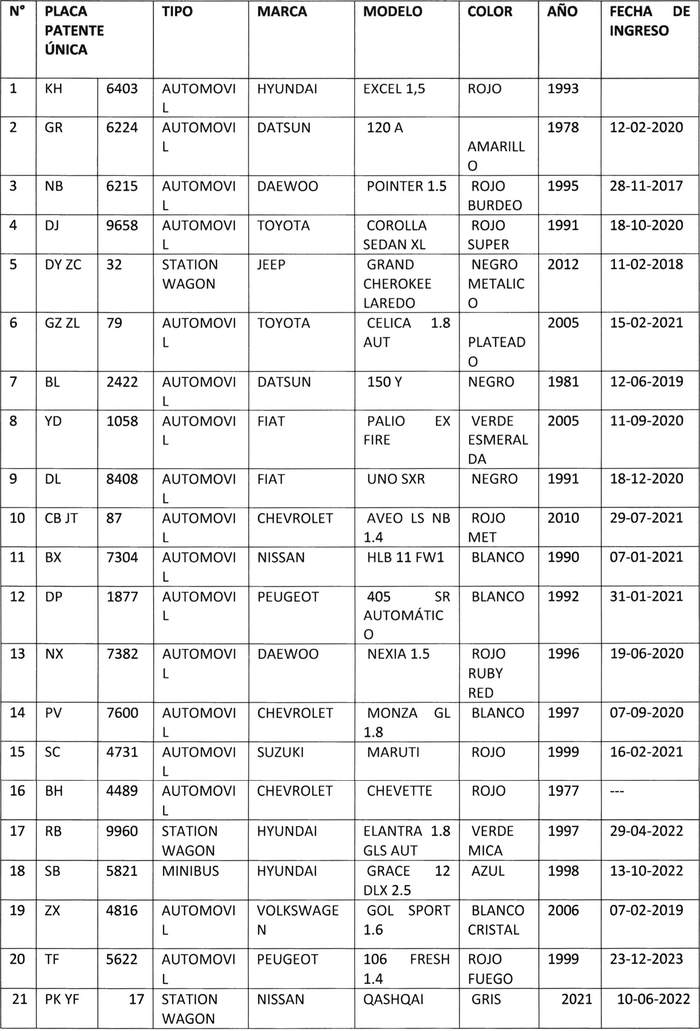 1. Publíquese por tres veces en el Diario Oficial el siguiente listado de vehículos que se encuentran ingresados en el aparcadero municipal, los días 17 de julio, 16 de agosto y 15 de septiembre del año 2023, mediando 30 días entre un aviso a otro: