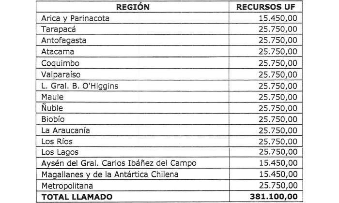 3. El total de recursos para la selección de proyectos postulantes al presente Llamado alcanzará por región los montos en Unidades de Fomento que se señalan en la siguiente tablaResolución 1972 EXENTA,