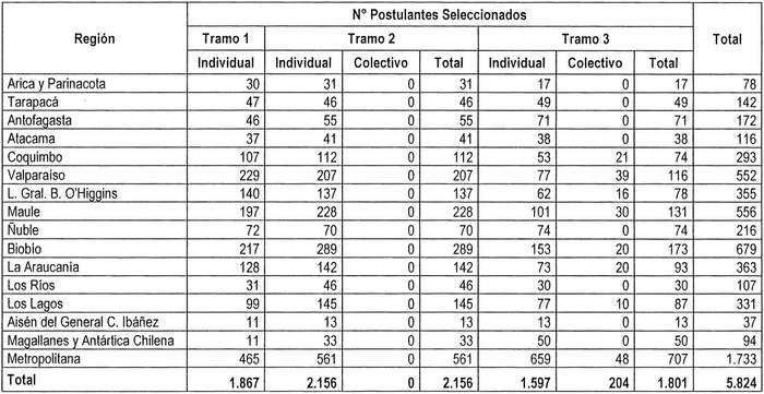 2º.- Apruébanse las nóminas de personas postulantes seleccionadas para el subsidio habitacional correspondiente al Primer Llamado Nacional 2023, del Sistema Integrado de Subsidio Habitacional, regulado por el DS Nº 1 (V. y U.), de 2011, en las modalidades de adquisición de viviendas y de construcción en sitio propio o densificación predial, tramos 1, 2 y 3, dispuesto en el resuelvo 1º de la resolución exenta Nº 634 (V. y U.), de 2023, nóminas que se acompañan en soporte electrónico, en archivo pdf, que se entenderán formar parte integrante de esta resolución, y fíjase el número de personas postulantes seleccionadas, de acuerdo a la distribución de recursos efectuada conforme a lo dispuesto en el resuelvo 2º de dicha resolución, por región, tramo, modalidad y alternativa de postulación, según se indica en las siguientes tablas: