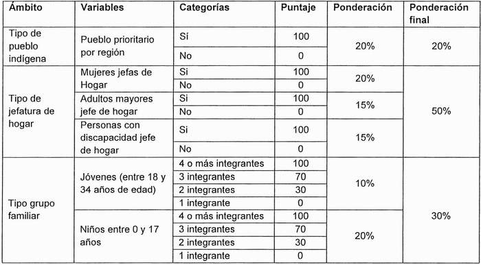 25. En función de lo acordado en la instancia de trabajo con la Comisión de Vivienda del Consejo Nacional de la Conadi, los factores para determinar el puntaje que definirá la prelación entre los postulantes serán los siguientes: