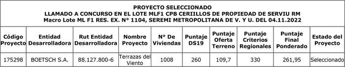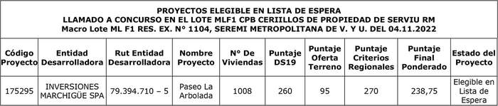 NÓMINA DE PROYECTOS ELEGIBLES LLAMADO A CONCURSO EN EL LOTE MLF1 CPB CERRILLOS DE PROPIEDAD DE SERVIU RM MACRO LOTE ML F1 RES. EX. Nº 1.104, SEREMI METROPOLITANA DE V. Y U. DEL 04.11.2022