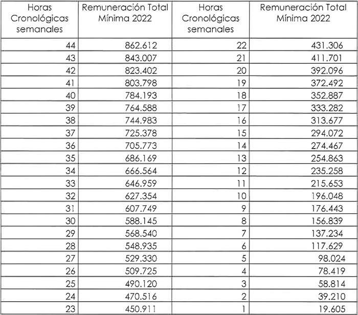 4° Que, el decreto N° 130, de 2022, del Ministerio de Educación, fijó la Remuneración Total Mínima para los profesionales de la educación que se desempeñen en establecimientos educacionales subvencionados y de administración delegada para el año 2022 en la suma de $764.727.- (setecientos sesenta y cuatro mil setecientos veintisiete pesos), para una designación o contrato de 44 horas cronológicas semanales, estableciéndose en el artículo segundo, la tabla con la aplicación proporcional para aquellas designaciones o contratos por un número inferior de horas cronológicas semanales;