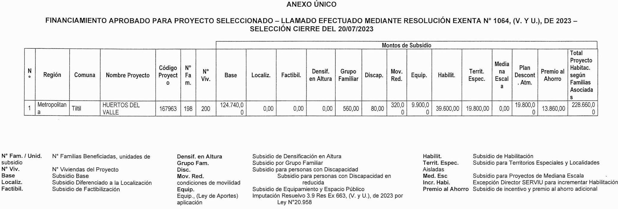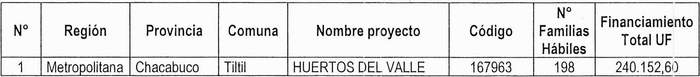 1. Apruébase el siguiente proyecto seleccionado, con su respectivo financiamiento total, para el otorgamiento de subsidios del Programa Habitacional Fondo Solidario de Elección de Vivienda en la alternativa de postulación colectiva, para el proyecto de Construcción en Nuevos Terrenos, en la comuna de Tiltil, correspondiente al proceso de selección cuyo cierre de postulación se verificó el día 20 de julio de 2023, del llamado efectuado por resolución exenta Nº 1.064 (V. y U.), de 2023: