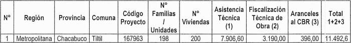 2. El monto del subsidio asignado de conformidad con el cuadro del Resuelvo 1. de esta resolución comprende los siguientes valores por concepto de Servicios de Asistencia Técnica, de Labores de Fiscalización Técnica de Obra y pago de Aranceles al Conservador de Bienes Raíces (valores en UF):