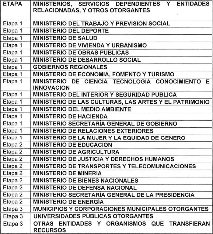En conformidad con la resolución precedente, el uso del SISREC será obligatorio para la rendición de cuentas de transferencias de recursos públicos imputados a los subtítulos 24, Transferencias Corrientes, y 33, Transferencias de Capital, del clasificador presupuestario, a contar de la fecha correspondiente a cada una de las siguientes etapas: