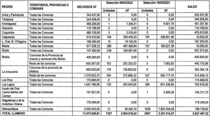 4. Los recursos comprometidos en el Resuelvo 2. de la presente resolución, para los proyectos seleccionados en el cierre de postulación efectuado el día 18 de mayo de 2023, del concurso a que se llamó mediante la resolución exenta N° 663 (V. y U.), de 2023, se resumen en el siguiente cuadro para cada región del país, incluyendo la suma total de familias beneficiadas y las Unidades de Fomento comprometidas, considerando los montos de subsidio de los proyectos, incluidos sus respectivos servicios de asistencia técnica y fiscalización técnica de obras: