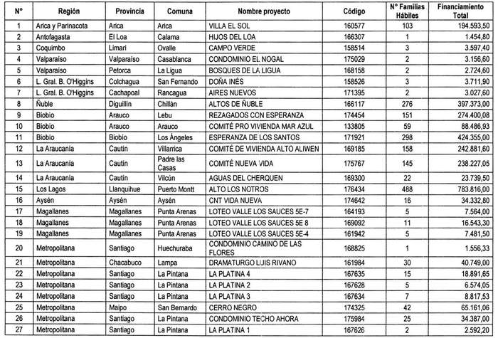 2. Apruébase la siguiente nómina de proyectos seleccionados, con su respectivo financiamiento total, para el otorgamiento de subsidios del Programa Habitacional Fondo Solidario de Elección de Vivienda en la alternativa de postulación colectiva, para los proyectos de Construcción en Nuevos Terrenos en las Regiones de Antofagasta, Resolución 1810 EXENTA,