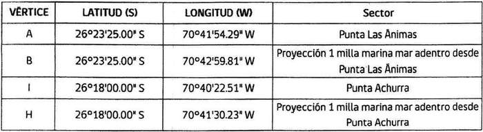 "c) Bahía de Puerto Chañaral, en el área comprendida entre Punta Achurra y Punta Las Ánimas, de acuerdo con las siguientes coordenadas: