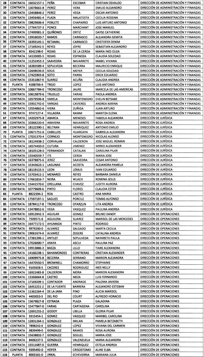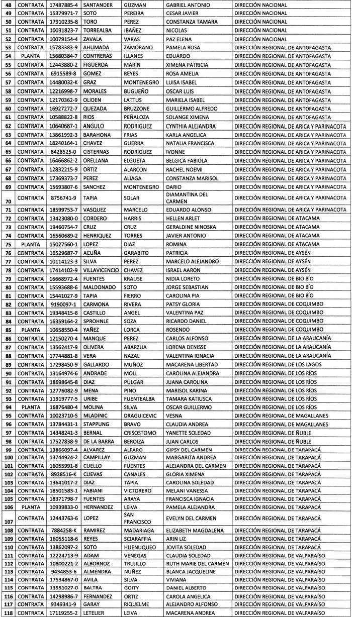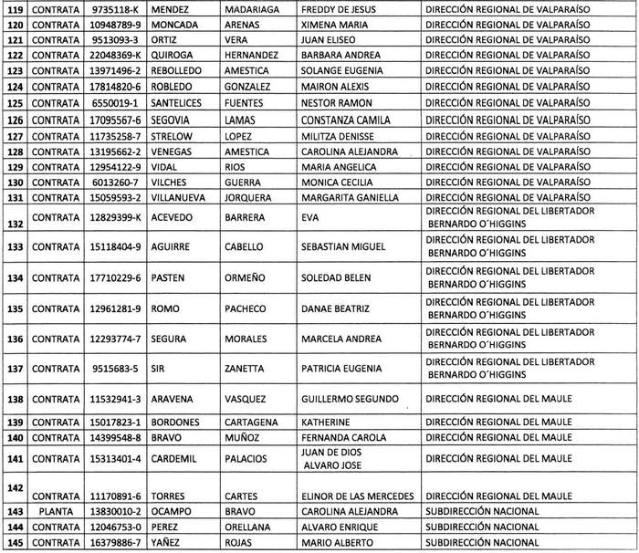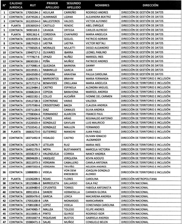 Equipo de Trabajo 1: Dirección de Gestión de Datos, Dirección de Territorio e Inclusión, Dirección Nacional, Subdirección Nacional, Dirección Regional de Antofagasta, Dirección Regional de Arica y Parinacota, Dirección Regional de Atacama, Dirección Regional de Aysén, Dirección Regional de Biobío, Dirección Regional de Coquimbo, Dirección Regional de La Araucanía, Dirección Regional de Los Lagos, Dirección Regional de Los Ríos, Dirección Regional de Magallanes, Dirección Regional del Maule, Dirección Regional Metropolitana, Dirección Regional de Ñuble, Dirección Regional de O'Higgins, Dirección Regional de Tarapacá y Dirección Regional de Valparaíso.