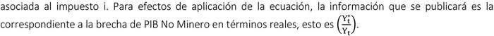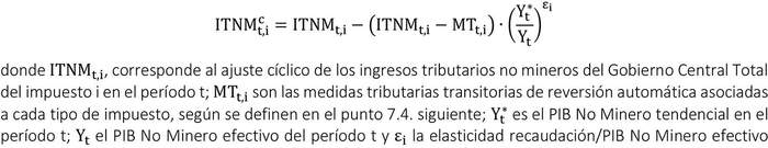 7.2. Para el cálculo de este Ajuste Cíclico, se utilizarán series de frecuencia anual, restándose a la partida de Ingresos Tributarios No Mineros la multiplicación entre dicha partida de ingresos menos una medida tributaria transitoria de reversión automática y el cociente que resulta entre el PIB No Minero Tendencial y el PIB No Minero efectivo para el año respectivo elevado a una elasticidad, es decir, un parámetro que rescata la sensibilidad de la recaudación tributaria al PIB No Minero, según la siguiente fórmula:
