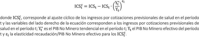Para calcular el Ajuste Cíclico de los Ingresos por Cotizaciones Previsionales de Salud se utilizarán series de frecuencia anual y se aplica una ecuación similar a aquella utilizada para el Ajuste Cíclico de los ITNM, pero con un parámetro que rescata la sensibilidad de estos ingresos al PIB No Minero, según la fórmula y valores que se indican a continuación: