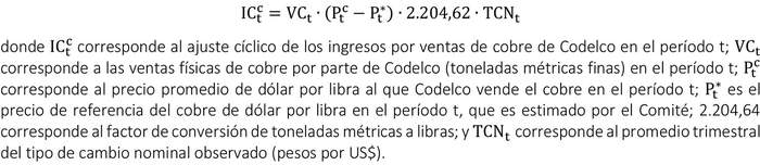 El Ajuste Cíclico de los Ingresos por Cobre Bruto (ICc) que se aplicará a los ingresos provenientes de los traspasos de la Corporación Nacional del Cobre (Codelco) al Fisco por las ventas de cobre, será equivalente a la diferencia entre las ventas físicas valoradas al precio efectivo y las ventas valoradas al precio de referencia, y se realizará corrigiendo estos valores por la brecha entre el precio de venta y el precio de referencia del metal, según la siguiente fórmula: