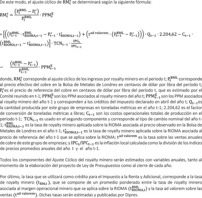El ajuste cíclico para el Impuesto Declarado se determinará según la diferencia entre el impuesto anual valorado al precio efectivo menos el impuesto anual valorado al precio de referencia del cobre. Para calcular las tasas de royalty minero aplicada sobre la Renta Imponible Operacional Minera Ajustada (RIOMA) se utilizará la información agregada de las GMP, y se calculará la tasa correspondiente al margen operacional que estas muestren en el agregado, valorada en primera instancia con el precio efectivo y posteriormente al precio de referencia. Lo anterior, sumado al componente ad valorem de 1,0% a las ventas anuales del año anterior, corregido por la brecha entre el precio efectivo del cobre y su precio de referencia.