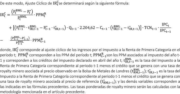 El Ajuste Cíclico de los Ingresos por el Impuesto a la Renta de Primera Categoría (IRc) consta de tres componentes: (i) ajuste a los ingresos por PPM del impuesto del año en curso, (ii) ajuste al Impuesto Declarado y (iii) ajuste a los ingresos PPM año anterior, todos ellos de las GMP. Tanto el Impuesto Declarado como los PPM año anterior utilizarán los precios del año anterior para el cálculo del Ajuste Cíclico.